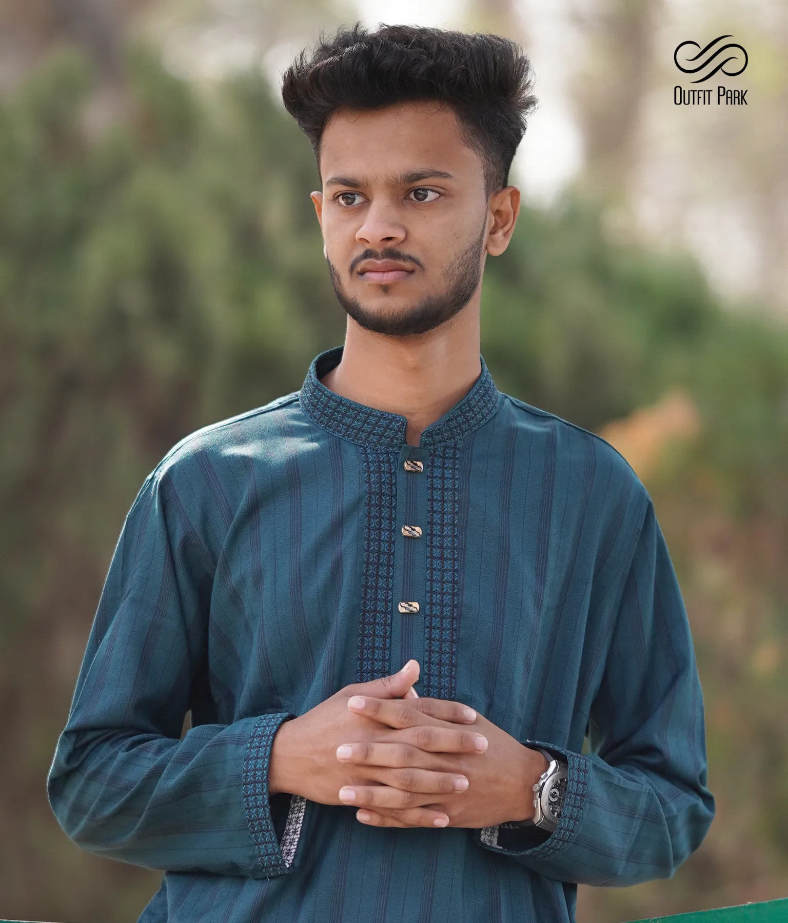 Deep Azure Shadow Stripe Premium Panjabi (Teal Blue)
