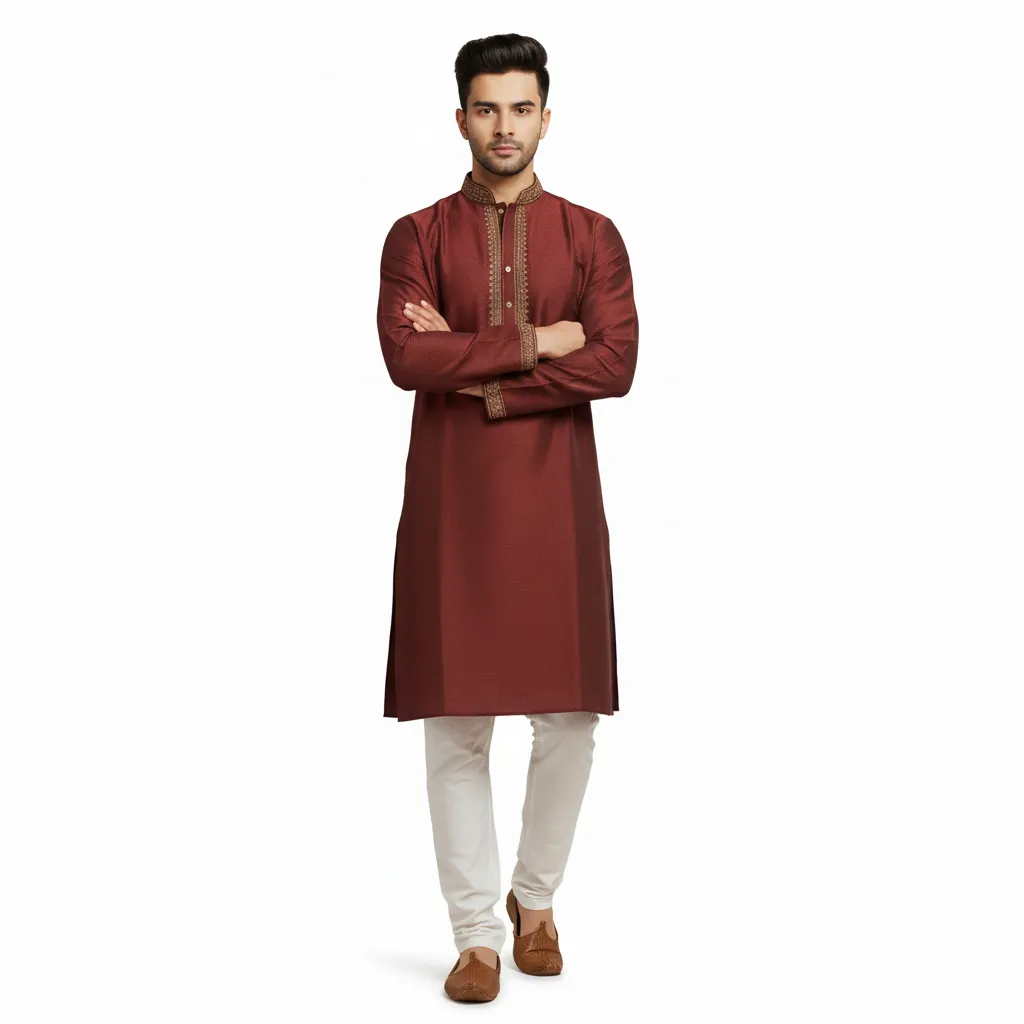৳ 300 offMake a statement at your next event with our exquisitely designed Men's Maroon Panjabi. This vibrant, rich maroon kurta is woven from a premium Art Silk or Silk Blend fabric, giving it a sophisticated texture and lustrous sheen that catches the light beautifully.