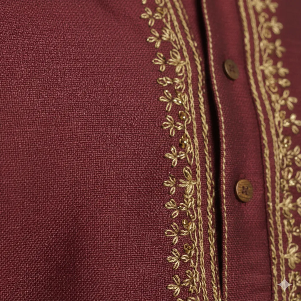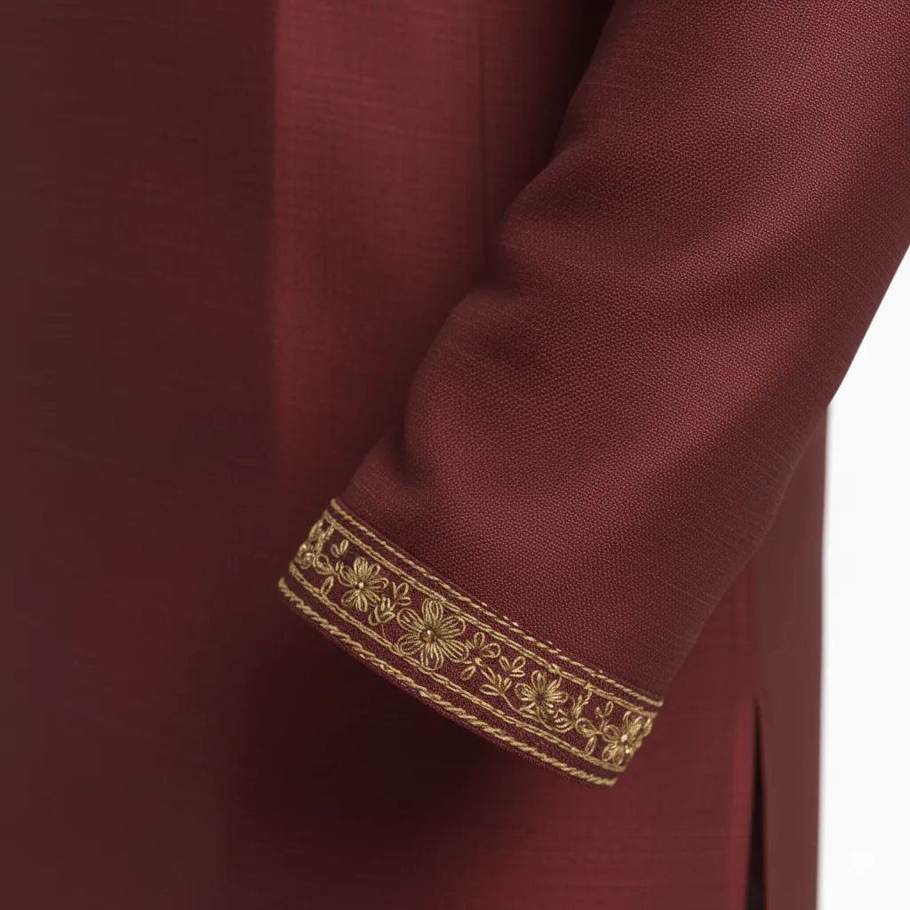 A luxurious maroon Panjabi (or Kurta) crafted from a rich silk-blend fabric with a subtle sheen. It features intricate gold thread embroidery around the collar and chest placket, extending to the sleeve cuffs. This full-sleeve garment is the ideal choice for weddings, parties, or festive occasions like Eid.