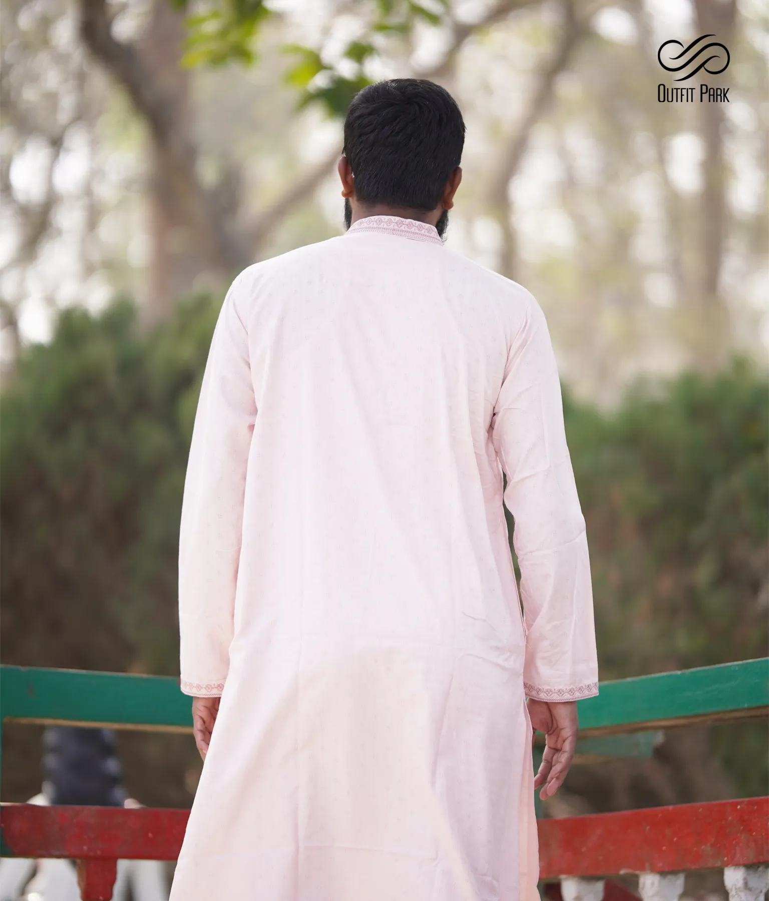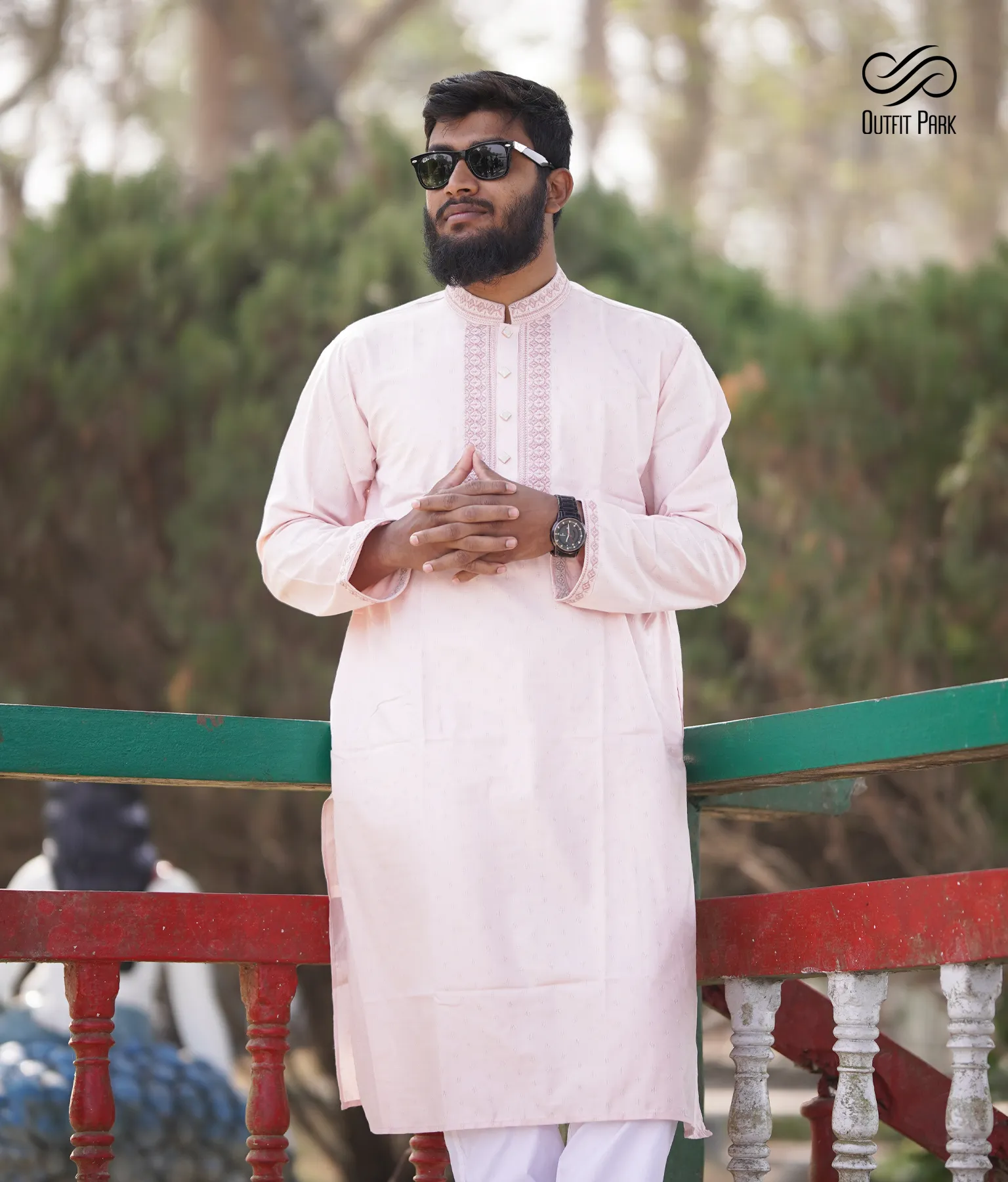 A perfect blend of elegance and sophistication. Crafted from premium textured fabric with intricate embroidery, this Panjabi offers a regal look for any festive occasion. The soft rose quartz hue ensures a distinguished and soothing presence.