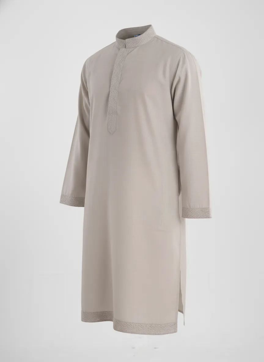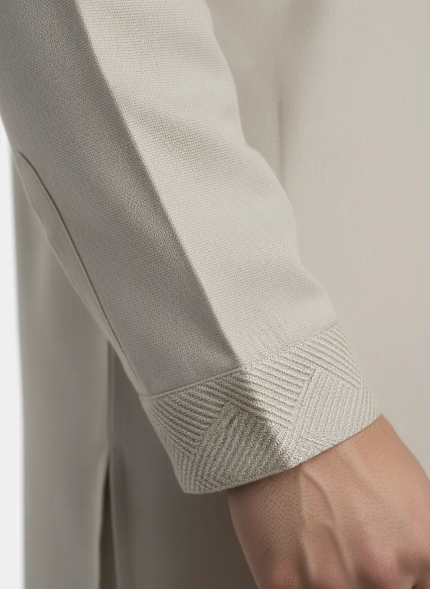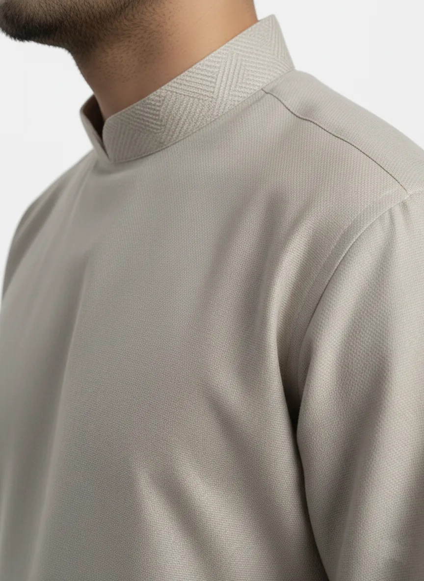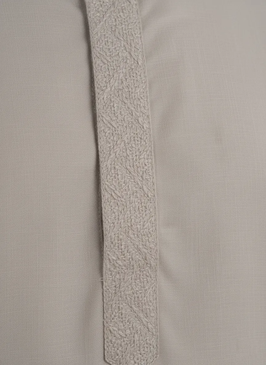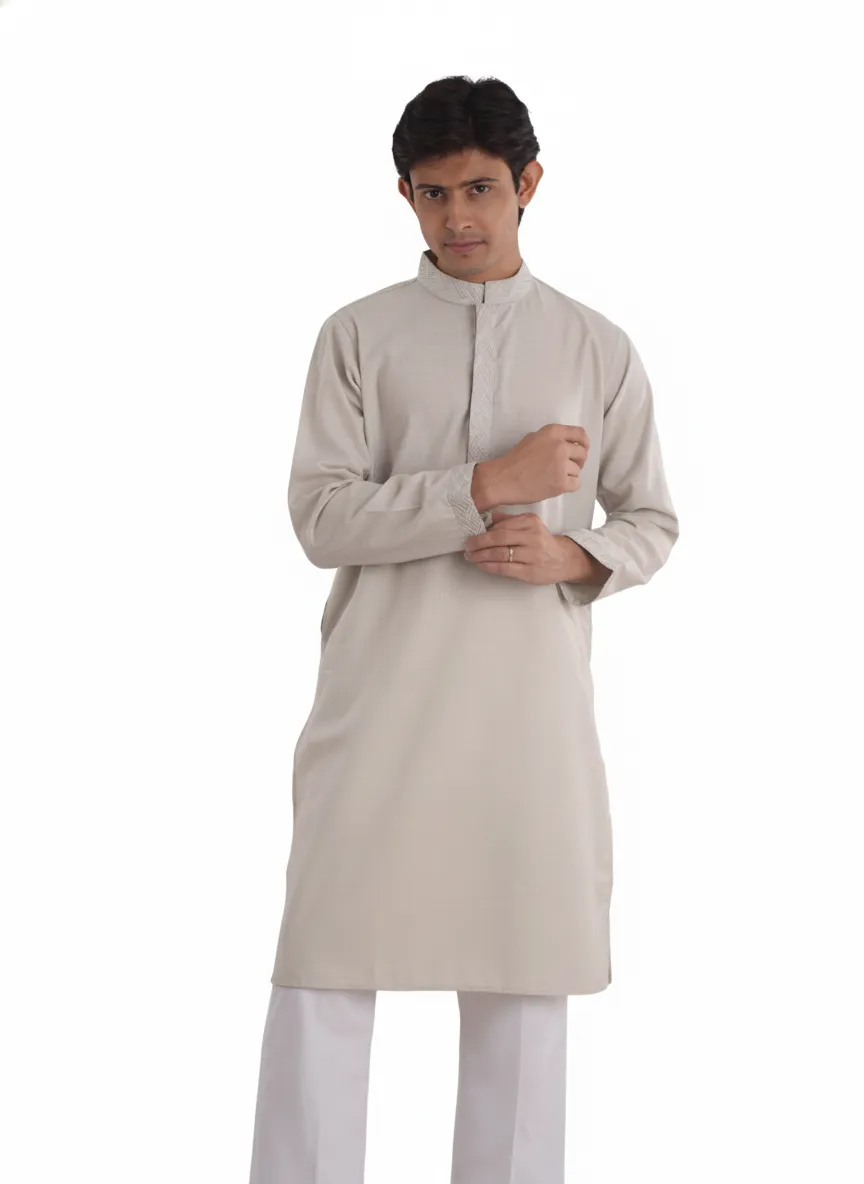 The Panjabi is made from a high-quality fabric with a beautiful, subtle texture and excellent drape, ensuring both comfort and a polished appearance. The distinguishing feature of this piece is the delicate, tone-on-tone geometric trim that is expertly applied. This woven or patterned detail elegantly outlines the Mandarin collar placket, cuffs, and lower hemline. The monochromatic patterning adds visual depth and detail without using contrasting colors, maintaining a refined and traditional aesthetic.