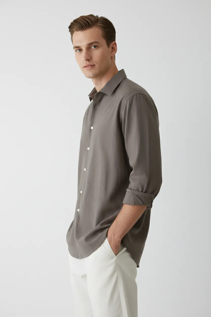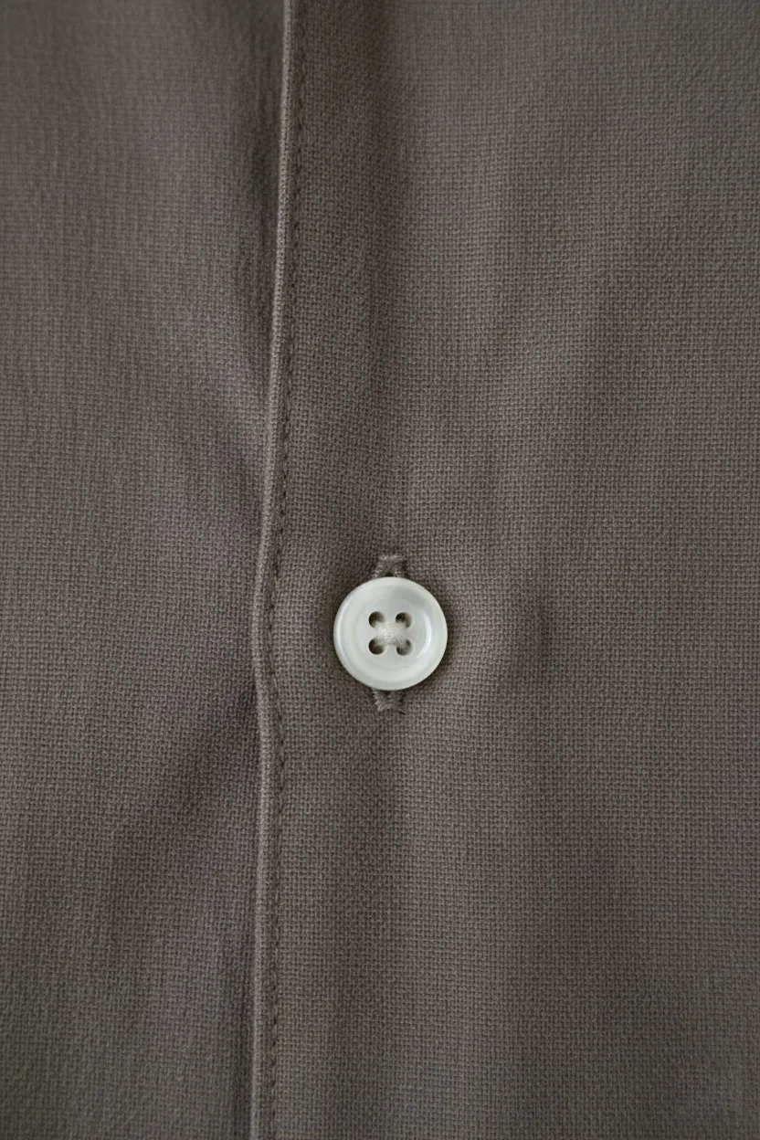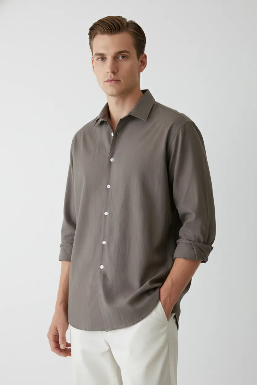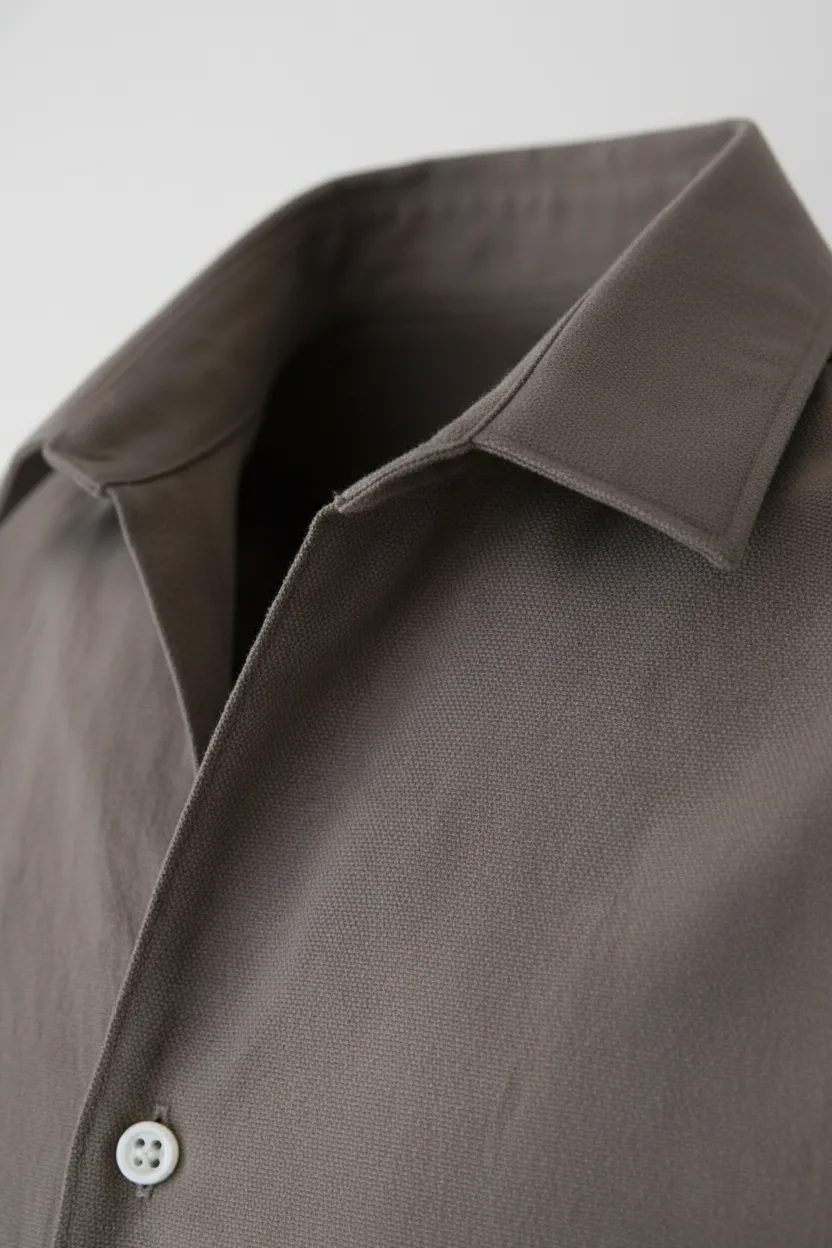A relaxed-fit, minimalist cotton shirt in a sophisticated taupe or stone color. Features a soft structure, classic collar, and simple white buttons, making it perfect for an effortless, contemporary casual look.